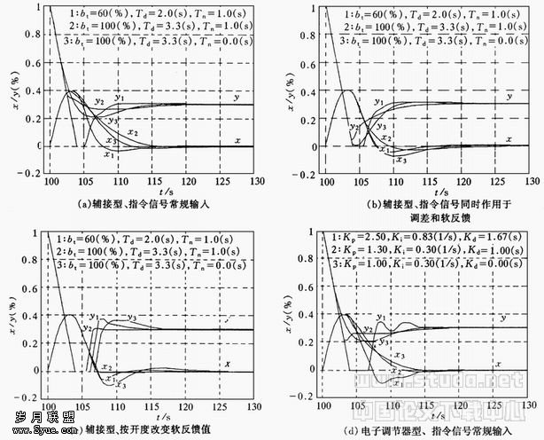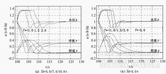 2.3 调节对象特性对甩负荷过渡过程影响 图4是采用辅助接力器型调速器得出了一组仿真曲线。图4(a)中分别取Tw=1.0s、1.5s、2.0s,相应的取Ta=5·Tw,T′s=4·Tw,bt=3·Tw/Ta,Td=2·Tw,Tn=1·Tw。从结果中可以看出,最大的转速上升值0.40、最大压力上升值0.36保持不变,最小值也保持不变,各特征点值发生的时间与Tw的大小成比例,或者说如果以t/Tw为横坐标,三条曲线将重合为一条曲线。在电站设计中,当水流惯性时间常数Tw确定后,根据水击压力上升允许值可计算出导叶直线关闭时间T′s。当T′s选定后,根据转速上升允许值可计算出机组惯性时间常数Ta,并按推荐公式求出调节参数。水流惯性时间常数Tw不但集中体现了调节对象特性,而且最佳调节参数也取决水流惯性时间常数Tw,所以,Tw决定了水轮机调节系统的动态过程形态和调节时间的长短。