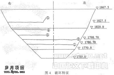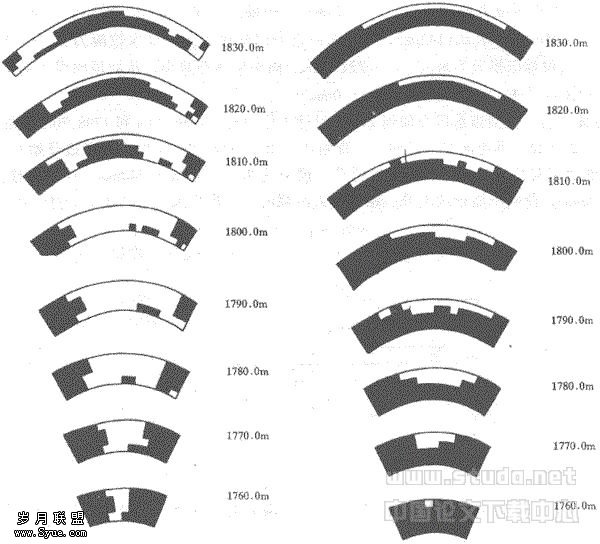 3.3 破坏特征 第一模型当水压力加到2.5倍设计水压力时,1786.70m和1798.70m高程沿水平碾压层面从右岸开始开裂,迅速向左岸延伸,一直到达左岸。1827.50m高程从右岸边开始开裂迅速延伸,接近拱冠,然后竖向转向坝顶。层面间的错动,模型达3mm,原型为240mm,径向位移由159.20mm增加到207.20mm,荷载不能继续上升,失去承载能力。拱坝破坏后的主要裂缝见图4。