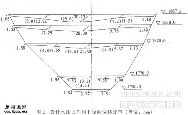 (2) 2.7倍设计水压力下的应力分布和径向位移。拱向应力σy:上游拱向应力分布是在1830.0m高程压应力为最大,σy=-12.74MPa,向两岸逐渐减小,全部受压,右侧压应力大于左侧。下游拱向应力全部受压,两端压应力最大,σy=-17.78MPa,中部应力呈马鞍型。梁向应力σz::上游面最大拉应力σz:=3.69MPa(实际ε=142με),下游梁向应力以受拉为主,最大拉应力σz:=7.64MPa(实际ε=293με)。径向位移以拱冠为最大,δr=224.8mm,向两岸逐渐减小,从坝顶向坝底减小,横缝处最大径向错动13.6mm,右岸横缝沿拱向张开8.0mm。