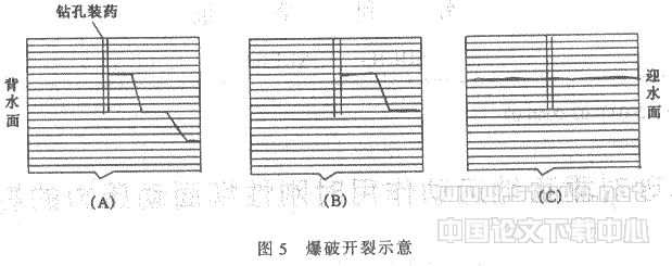 图5为各种破坏模式,A表示爆破裂缝呈阶梯形,跨3个冷缝层面,表明层面粘结良好,B表示层面为“光板”粘结较差,但也呈阶梯形,C为全层面呈光板,成为光裂面。如果钻孔在1/2坝体位置,则裂缝突向外表面,即沿径向突出迎水面,但也有个别破坏面在背面,当迎水面施工质量优于背水面时,才能出现这种情况。图5显出层面粘结的不均匀性,同一层面,时好时坏,方可能出现阶梯破坏状态,从平面看裂缝破坏呈漏斗状,而不是一直线,当密集钻孔成一条直线时,才可能成为一条直线或近似一条直线。应指出的是岩滩拱围堰为一临时建筑,水泥用量少,施工质量控制较永久性建筑差,方可出现以上的那些极端问题。