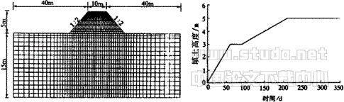 为了分析土工织物的加筋效果,以及进一步检验上文模型对加筋效果的反映程度,本文采用上述方法对某加筋堤坝工程进行分析。某堤坝工程几何尺寸、计算网格及路堤的施工工程如图6所示,堤底设置50cm厚度的砂垫层,内夹设一层加筋有纺土工织物。为了便于说明问题和计算简便,计算时对地基条件作了简化,认为地基软土为同一种土体,地基计算深度为15.0m,其下为基岩,取原地基中最主要的土体为淤泥质粉质粘土。土体模型仍采用邓肯-张双曲线弹性非线性模型,模型计算参数如表2所示。其中土工织物其初始切线模量为Ebi为640kN/m,抗拉强度K2=57.4kN/m。预应变取1%计算。利用上述编制的有限元程序将加筋堤和非加筋堤分别进行沉降和稳定计算。