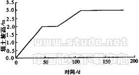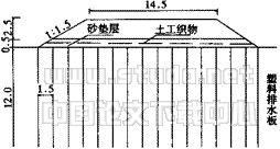 3.1 工程概括 某试验段工程采用土工织物加筋和塑料排水板联合处理软土地基。其地基各土层情况见表1所示。路堤设计断面如图2所示。土工织物铺设时施加了约1%的预应变。土工织物铺设于砂垫层之间。塑料排水板的打设长度为12m,间距1.5m,采用正方形布置。路基沉降观测及路基基底土压力观测布置于K18+500断面,该断面的施工加载过程如图3所示。