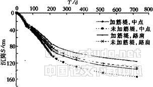 4.1 沉降计算结果 沉降计算结果可以发现加筋能够调整地基的附加应力,限制土体的侧向变形以及增加路堤本身的变形刚度和总体性等作用,从而能减小地基的沉降和不均匀沉降。图7为堤坝中点与路肩对应点的地基沉降-时间曲线。从图中可以看到,土工织物加筋的存在可以有效地减小沉降。如地表路堤中点在第210d时沉降量加筋堤为87.9cm,非加筋堤为99.9cm,相比减小沉降12cm,约12.0%;在第730d时加筋堤为134.3cm,非加筋堤为153.3cm,相比减小沉降19cm,约12.4%,最终沉降(计算至6000d)加筋堤为148.0cm,非加筋堤为168.6cm,可以减小最终沉降20.6cm,约12.2%。不均匀沉 降(路中与路肩)在第210d时可减少18.2%,在第730d时可减少20.3%。说明加筋的效果较为明显。
