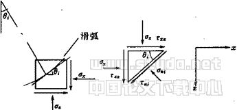 与常规圆弧滑动计算一样,在一定的范围内人为给出不同的圆弧试算。对于给定的圆弧,首先判断圆弧所穿过的单元号和单元数。然后逐个求出每一个被穿过单元滑弧面上的剪应力和抗剪强度。如第i单元,其受力状态如图8所示,根据单元形心处的应力,求出滑弧在此单元所形成斜面的剪应力τni和正应力σni,以及此斜面上抗剪强度为τfi,根据安全系数的定义,此滑弧的稳定安全系数为: