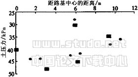 3.3 计算结果 采用已编制的复合有限元程序可得到此断面中心点的沉降时程线如图4所示。从图中可以看到,计算结果与实测值相当吻合。现场埋设了4个土压力盒,施工一个月后其测试值见图5所示。而土压力盒附近点由计算得到的土压力值也绘于图5中。由于本工程打设了塑料排水板,在计算时作了等效,而且认为塑料排水板处的超静孔压力为0,这些处理影响了计算的精度。但从图中看到,计算和实测还是较为接近。从这个实例的计算结果与实测结果的一致性可以证明上文的模型有一定的可靠性,可以利用此程序来分析土工织物的加筋效果。