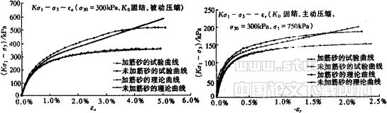 对于一般的三轴剪切试验,通常是先进行等向固结再剪切,为了更好地模拟加筋的实际受力和变形情况,避免在试样等向固结过程中将土工织物压皱而引起误差,试验除了等向固结试验外,还进行了三轴不等向固结试验。不等向固结情况下初始固结尽量取K0状态,可使得土工织物事先既不压皱,也不被拉伸。限于篇幅本文对试验过程和试验结果不作介绍,详细内容可见文献[2],这里仅选取两个试验结果如图1。这两个图分别是用来分析加筋复合体竖向和水平向模量的,其中加筋砂的理论曲线是根据上述公式而得,从中可以看到试验曲线和理论曲线较为吻合,特别是初始阶段,完全能满足工程需要。从其它试验结果来看,文献[1]所得到的一些公式也有较好的精度。