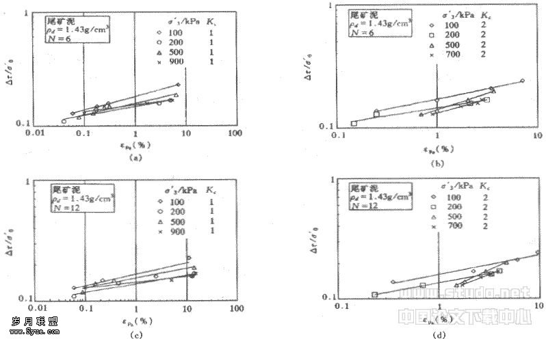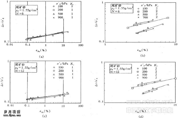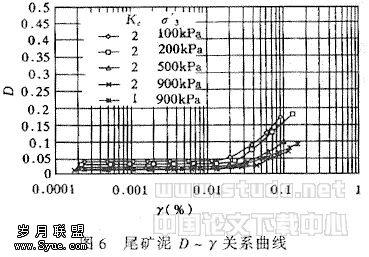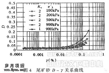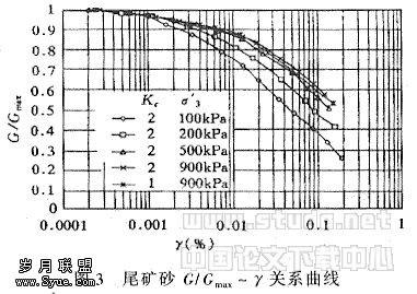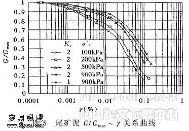 (1)按常规土分类,尾矿泥在塑性图中属粉土范围,应具有粘性土的特性,但是,由于其颗粒中石英含量较多,粘土矿物颗粒较少,矿物成分具有尾矿砂的特点,试验中表现为亲水性很弱,容易发生突然的破坏性应变,动力变形特性和尾矿砂非常相似,天然地基少粘性土层的一些和标准对于用尾矿泥充填的地基土层是不适用的。(2)无论是尾矿砂还是尾矿泥 ,对于同一种尾矿料,在不同的固结比(Kc=1至Kc=2)条件下,其压力效应的试验结果非常接近,在双对数坐标中可近似用同一条直线来表示;对于不同的尾矿料,在固结比相同,(Kc=1或Kc=2)的条件下,饱和尾矿砂和尾矿泥的最大动剪模量指数n较为接近,但是,它们的最大动剪模量系数C值是有差别的,尾矿砂大约是尾矿泥的1.5倍左右。(3)饱和的尾矿料对于振动荷载非常敏感,当试样受到振动荷载作用时,较小的动应力就会使试样进入弹塑性变形阶段,一旦进入弹塑性变形阶段,在较小的动剪应力比范围内试样就会因残余轴应变εpa的迅速增大而进入破坏状态。饱和尾矿泥的这种特点尤为明显,不仅动剪应力比范围小,而且动剪应力比的值也比较小,一般不超过0.25。(4)在等压固结条件下,侧压力σ′3对饱和尾矿料残余轴应变εpa与动剪应力比Δτ/σ′0关系的影响可以忽略不计,但是在偏压固结Kc=2的条件下,其影响还是应当考虑的,对于同一种尾矿料,在相同的动剪应力比作用下,侧压力σ′3越大,残余轴应变εpa也就越大。(5)对饱和尾矿砂和尾矿泥来说,无论是固结比Kc=1或Kc=2,在固结应力条件和振动次数N一定时,残余轴应变εpa随动剪应力比Δτ/σ′0的发展变化,在双对数坐标中均呈线形关系。对振动荷载具有特别敏感性的饱和尾矿料,动剪应力比的变化范围较小,根据试验成果,残余轴应变εpa与动剪应力比Δτ/σ′0的关系可用幂函数形式近似用式(2)和式(3)表示。