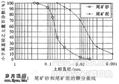 试验所用尾矿料取自一个铁矿的尾矿库。该尾矿库中的尾矿料大致可分为两种,尾矿砂和尾矿泥,大部分位于水下,处于较为疏松的饱和状态。尾矿砂的比重为2.88,平均相对密度约为0.49,中间粒径约为0.058mm,属颗粒较细的尾粉砂,其中还含有少量的尾细砂,主要成分是石英,不均匀系数为4.1,属于不良级配;尾矿泥的比重为2.84,饱和含水量为34.9%,孔隙比为0.99,中间粒径约为0.006mm,根据液限和塑限试验结果,其液限为29.2%,塑限为23.0%,塑性指数只有6.2,按塑性图分类,属于尾粉土,由颗分曲线可知,颗粒中小于0.005mm的粒径含量为39%,在显微镜下观察,其颗粒中石英含量较多,粘土矿物颗粒较少,矿物成分具有尾矿砂的特点,试验中发现,它的亲水性很弱。由现场地质勘测资料分析,试验中所用的尾矿砂和尾矿泥,试样制备干密度分别取为1.55g/cm3和1.43g/cm3,颗分曲线见图1。