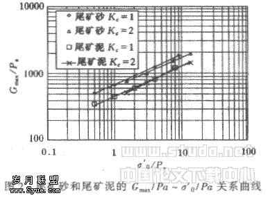 2.1 压力效应 通过共振柱的压力效应试验,分别得出尾 矿砂和尾矿泥的最大动剪模量Gmax与平均有效主应力σ′0=(σ′1+σ′3)/2的关系曲线,如图2所示。在双对数坐标中,最大动剪模量Gmax与平均 有效主应力σ′0之间为直线关系,可以用如下的幂函数形式表示[3]: