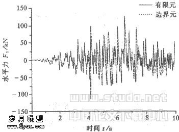 图2表示了流体在EL Centro(N-S)地震波作用下(峰值加速度为3.417m/s2)对槽身(按槽身长度为12.0m计算)水平剪力的时间历程,图中分别采用了两种计算方法,可以看出,有限元法与边界元法两个结果在总的时间域上相当一致,其最大反应值亦极为接近,边界元解为|Fl|max=1298.0kN,有限元解为|Fl|max=1311.7kN。