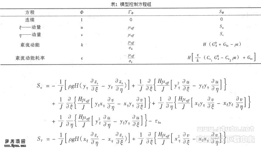 式中:Φ为所求问题的因变量;U和V分别为直角坐标下流速u和v的逆变分量,仅在对流项中出现;ΓΦ为扩散系数;SΦ为源项。当Φ表示某一特定量时,ΓΦ和SΦ对此特定量有特定的意义和表达式,这时方程(3)亦赋予特定的意义,模型的控制方程组如表1所示。