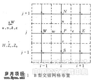 如图1所示,本文采用B型交错网格,即将u,v,k,ε及各标量布置在网格中心,将水深相关项H、z?s、z?b项布置在网格的左下方节点上。这样布置有以下两个优点:①有利于边界条件的引入;②在编写程序u,v,k,ε各方程共用一套系数,可节省程序代码,使程序简单明了。