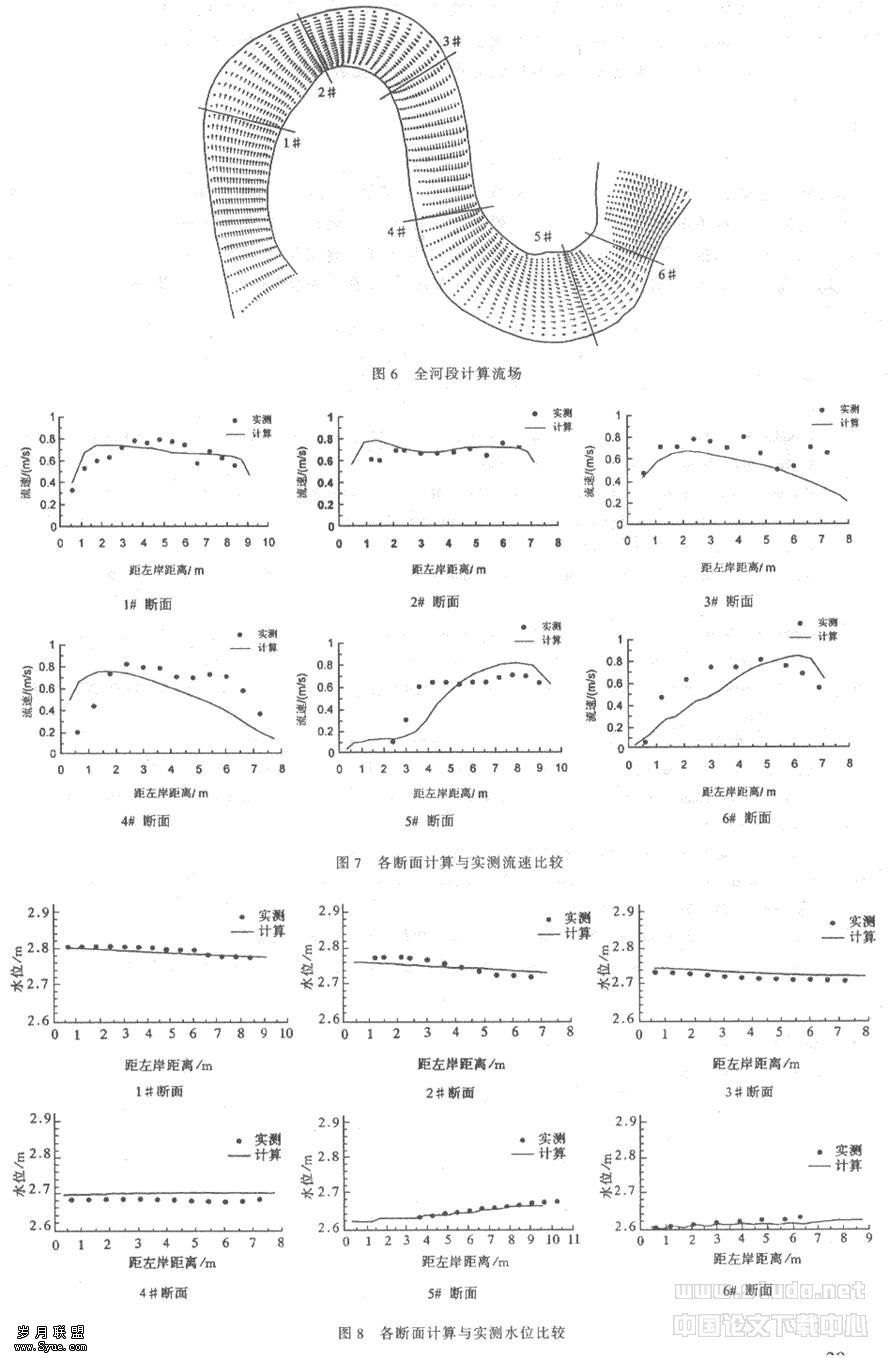 为了进一步对本模型进行验证,作者选用具有实测资料的6个断面的流速和水位与计算值进行比较。由于本河段属于冲积性多沙河流,计算中糙率以及河底高程很难调整到与实际情况完 全相符,使得计算中存在一定的误差,而且在一些断面上个别点的计算结果与实测值存在着较大的离散,但总体看来计算结果能够满足工程需要。流速比较见图7,水位比较见图8。