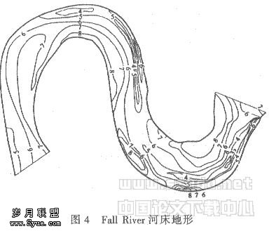为了使本文数学模型具有代表意义,本文采用天然连续弯道河流——美国Colorado洲Fall River部分河段的实测水流资料进行验证。该河段长120m,平均河宽8.5m,其河床地形资料如图4所示。流量为4.1m3/s,上游水位2.85m,下游水位2.61m。用坐标变换的方法将物理平面转换到计算平面。如图5所示,整个河段可划分为91×20个网格,网格长度平均0.4m,宽度平均0.09m。