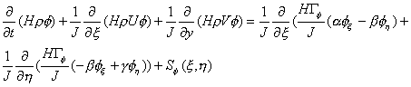 方程(2)转换到曲线坐标(ξ、η)下,仅在对流项中使用流速的逆变分量,而在其它项中使用原始变量,这样既简化了方程,又使所有方程仍可写为曲线坐标下的通用方程,模型的微分方程可写为如下通用形式:
