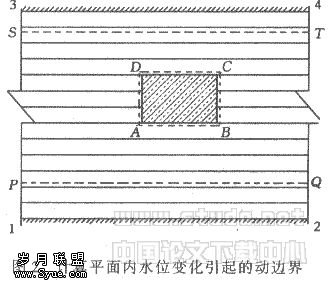 在水陆边界,在河流、河口、海湾的非恒定流场时,水位不是恒定不变的,而且每一时间步长的水位可能都不一样,这就带来了水陆边界的移动,如果每一时间步长都进行坐标变换而生成新的网格是非常不的。于是本文在前人“冻结法”的基础上,提出了适合k-ε双方程紊流模型的“移动边界的壁面函数法”。如图2、图3,水位变化后,使边界处的网格干出,原来的岸边界12、34变成了新的岸边界PQ、ST,而壁面函数仍然布置在12、34岸边界处;水域内岛屿由于水位的变化而出露,其岛屿内部按“冻结法”来处理,其边界ABCD周围也需用壁面函数法来处理。本文采用“水位扫描法”来判断新的水陆边界:①从边界12向34扫描,如水深不为零,则令其为起始点;②从边界34向12扫描,如水深不为零,则令其为终点;③然后扫描水域内部,确定岛屿的边界ABCD。之后对水陆边界实施壁面函数法。