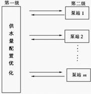 数值模型的建立运用了系统工程两级递阶优化原理,见图1。在第一级优化过程中,以供水成本最小即耗电量最小为优化目的,通过对系统的水力分析和运行费用进行计算,确定当前状况下各泵站最优供水量和合理扬程,以满足管网用水量的需求和各用户对服务质量的要求。在第二级优化过程中,决定各泵站内各型泵的开启数和组合方式,有调速泵的泵站应决定调节因子。然后在两级优化过程之间反复协调,最终逼近最优解或次优解。