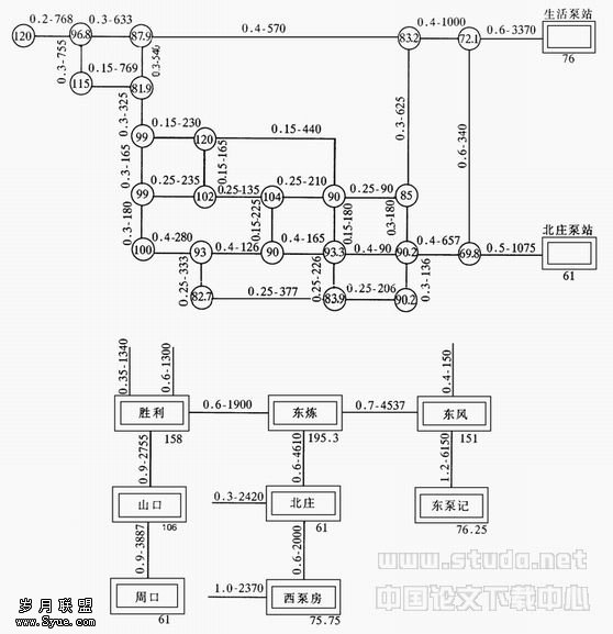 注:上图为生活管网,圆圈内数字为当地高程,线段上数字为管径?管长,均以m计, |