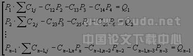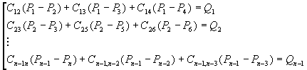 ② 从式(5)求得各管段压降hij;可应用线性理论引入一个变量;Cij=|qij|/|hij|将上式代入每个节点的流量平衡式:Qi=∑qij=∑Cij(Pi-Pj)。如果节点1与节点2,3,4有相连管段,节点2与节点3,5,6有相连管段,节点N-1与节点N,N-2,N-3有相连管段,可写出:
