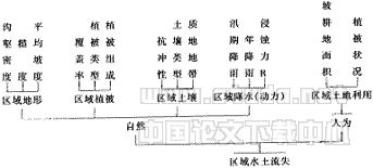 2.1 区域水土流失的影响因素 区域水土流失作为水土流失研究的一个分支,它具有传统水土流失研究的一般共性。影响区域水土流失的因素同样包括自然和人为两个方面:自然因素有气候(降水)、土壤、植被、地形4个因子;人为影响则主要指土地利用方式及土壤保护措施等[1]。在各影响因子的内部,每个因子又可由若干个次因子来反映,我们可以通过构造一棵影响因子树来表征这种关系(图1).但较传统的水土流失研究不同,影响区域水土流失的各因素是区域气候特征,区域土壤特征、区域植被状况、区域地形条件及区域土地利用状况,其度量指标通常是一些能够反映区域宏观综合特征的概化指标,如地面糙度、沟壑密度、植被覆盖率、坡耕地面积等,而非一些“微观”的度量指标,如坡度、坡长等则较难应用,但有些微观指标可以根据区域内部的客观情况向区域的层次引申,如黄土高原的土壤质地具有明显的分带性,则反映土壤质地的土壤颗粒组成这一微指标就可以结合区内的质地分带情况应用于区域研究。
