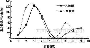 与产流量相比,产沙量的波动要剧烈很多。实验中含沙量最小为0.01g/ml,最大为0.47g/ml,相差近50倍。侵蚀动力不同是造成含沙量差别如此之大的主要原因,而其中重力侵蚀又是导致坡面高含沙水流的主要原因。