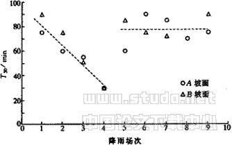 图2反映了A、B两组实验中T50的变化过程。可以看出,两组实验中T50在坡面发育早期存在着减小的趋势,而在第五场以后重力侵蚀发生的时间则较晚,T50在80min左右开始波动。T50的这种变化趋势主要是由于坡面发育不同阶段主导重力侵蚀类型的变化而造成的。实验中的重力侵蚀产沙量主要由溯源侵蚀和沟壁崩塌产沙两部分构成。这两种重力侵蚀产沙的机理不同,溯源侵蚀产沙量的大小主要受上坡来水量的控制,坡面上坡来水量大,在沟头下方的掏蚀越深,沟头坍塌越严重,溯源侵蚀量也就越大;沟壁崩塌则可能与沟道下切、侧蚀和土壤含水量增大造成土壤膨胀等原因有关。从实验现象的观察来看,在坡面发育早期,溯源侵蚀在降雨开始后不久就开始活跃,而沟壁崩塌则发生时间较晚。坡面发育早期阶段T50的减小主要是由细沟溯源侵蚀的变化所引起。第一场降雨中,细沟一般在降雨50min以后形成,其后溯源侵蚀等类型的重力侵蚀才会发生,T50较大;细沟形成后的其后几场降雨中,上坡来水量较大,细沟也有着充分的延伸空间,自降雨后不久就开始溯源侵蚀,因此T50较小。随着细沟的发育,沟头以上的来水面积逐渐减小,相应的来水量也逐渐减小。当沟头以上来水量已不足以使沟头进一步向坡顶延伸,溯源侵蚀就基本停止,此时重力侵蚀的主要类型转化为沟壁崩塌。在这一阶段中,沟道发育已十分缓慢,由于沟道下切和侧蚀造成沟壁失稳形成的崩塌已基本停止,土壤含水量增大导致土体松软成为引起沟壁崩塌的一个重要因素,而降雨量几乎是实验中唯一的影响土壤含水量的因素。降雨时间越长,降雨量越大,土壤含水量就越大,发生重力侵蚀的可能就越大。因此,重力侵蚀往往发生在降雨的后期,而实验中降雨强度在所有场次中保持恒定,所以T50大致在降雨后期进行波动。
