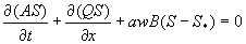 明渠或天然河流常被考虑作为一维流动,根据洪水波运动的圣维南方程、泥沙连续方程和泥沙扩散方程,可以简化推导出一维非恒定流泥沙数学模型的基本方程,其形式为水流连续方程