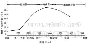 基于以上条件,游荡型河流的河岸和河床边界一般为单一,河床以细砂或粉砂组成为主,如黄河下游苏泗庄以上河段,河床中粉砂 粘土含量一般在15%左右;曲流型一般说来河岸为混合或二元,而河床以粉砂 粘土组成为主,如黄河下游的孙口段河床中粉砂 粘土的含量最高达60%以上;黄河下游顺直微弯段,河床中粉砂 粘土含量约为45%,如图4所示。 5 河床断面形态的地貌临界判别 河流作为流域的一个组成部分,它的许多性质又是和流域因素分不开的。 |