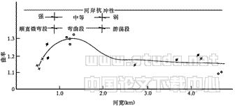 伴随着河床物质影响河型的同时,河岸的相对可动性也同时影响着河流的平面形态。在一定流量的情况下,河宽的大小反映了河岸侵蚀后退的程度。因此,可用河宽作为河岸相对可动性指标。不同的河型具有相应的临界河宽。一般说来,河岸抗冲性极强或极差的河流多为低曲率河流,其河宽可以很大或可能很小,而具有一定(中等)抗冲能力;河岸可动性适中的河流多具有较高的曲率。从图2看出,黄河下游三种不同河型的平面形态与河宽的显著差异:顺直微弯段的河宽小于1000m(>40m),河岸的相对抗冲性最强,曲率最小,即1.15,为人工控制的结果;过渡段河宽介于1000~2000m,河岸的相对抗冲性中等,曲率最大,即1.30;游荡河段的河宽大于3000m,河岸的抗冲性最差,因此,曲率也最小,即1.14。由此可见,黄河下游不同河型,具有明显的临界河宽。