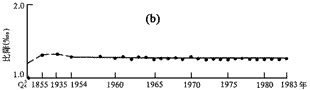 从图1(b)来看,仍以1954年为界,1954年后的河床比降均在均值上下微小变化,多年平均为1.28,与最大和最小值的偏离,分别为2%和1%,比凹度的偏离还小。