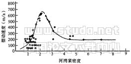 通过黄河过渡段河湾摆动速度与紧密度的资料研究表明,也有类似的规律。开始,随着河湾紧密度的增加,摆动速度迅速增大。当紧密度达到2.4左右时,摆动速度达到最大值(临界最大摆速),约为600m/a。此后,随着紧密度的继续增大,摆动速度逐渐减小,当紧密度达到4.0以上时,摆动速度趋于稳定值(图3)。黄河下游这种河湾紧密度与河床摆动速度的临界关系,反映了河湾紧密度对河床演变速度的控制作用,这是研究弯曲河流不可忽视的因素之一。