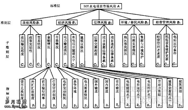 由于BOT方式的特殊性,其风险因素也有其独特性.归纳起来可概括为风险B,、经济风险B2、风险B3、环境与移民风险B4,及经营管理风险B5等5种风险[2].对5种风险进行分析,进而得到国际BOT水电项目风险评价指标体系.对这些因素的综合评价,就构成了BOT水电项目的风险情况,将影响项目风险用定量方式表示,构成BOT水电项目风险模型,见附图,作为最终是否进入该国采用BOT方式承包的理论依据并加以实施.