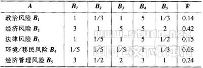 按层次分析法,对影响项目风险由专业人员组成的评估小组进行打分,得风险判断矩阵如表1,并求得归一化相对重要性排序权值W.