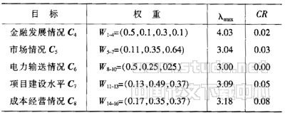建立判断矩阵,判断矩阵元素的值反映了人们对各种元素相对重要程度(同等重要、稍微重要、明显重要、强烈重要、极端重要)的认识,一般采用数字1~9及其倒数的度量方法.求解判断矩阵的特征根,得到的特征矩阵进行归一化得到重要性的排序权值.同一层次所有因素对于最高层次(总目标)相对重要性的排序,称为层次总排序.为了保证结果有满意的一致性,要求随机一致性比率CR>O.1.用层次分析法综合得出投资项目风险评价结果.
