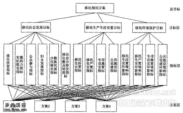 根据移民规划综合评价的特点和要求,经过分析、筛选,可以提出一个类似下列可供的层次体系。