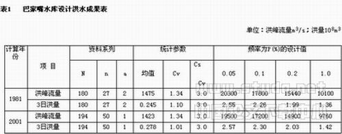 巴家嘴水库的设计洪水,自从1958年开始以来,不同单位曾先后进行过十多次分析。各次计算除采用资料系列有所差别外,就是对洪水资料的采用有所不同。最有代表性的是1981年巴家嘴水库增建泄洪洞工程初步设计时的设计洪水成果,其采用的洪水资料系列为1962~1978年,1947年的历史洪水重现期按1901年以来第一大洪水处理,重现期为87年。该设计成果通过了部审查。本次将洪水的资料系列延长至2000年,1947年的历史洪水按实测系列处理,重现期相当于50年一遇,复核后的设计洪水成果与1981年成果比较见表1。