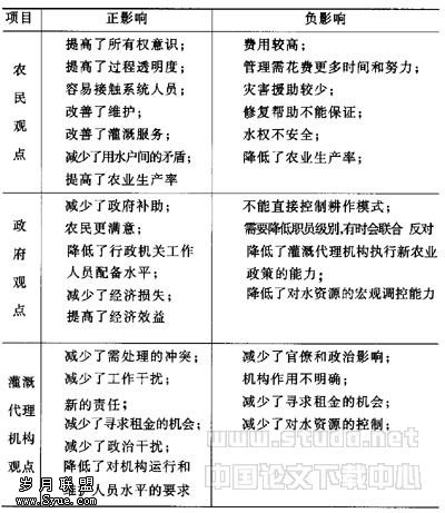 第四,在政府方面,削弱了对系统内全部灌溉活动的控制,并且减弱了利用灌溉作为执行国家其他政策和应优先考虑事项的工具的能力.例如,在一定的季节提倡栽种旱作物,而不是水稻,这可能是政府所希望的.过去,可能是由灌溉代理机构调节供水计划和供水量来实现这一目的,在转移后,这将比较困难.