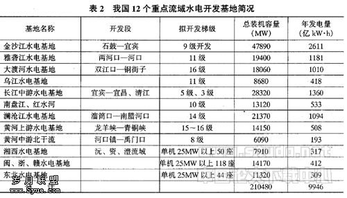 我国水能资源总量居世界首位,有很大的开发潜力。长期以来,电力部根据水资源的分布情况、开发条件和经济发展的需要,提出了建设流域水电开发基地的方案,重点为12个大水电基地。规划总装机规模为210480MW,年发电量9946亿kW·h。12个重点水电开发基地情况见表2。