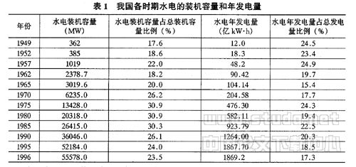 我国水电开发起步较晚,1912年修建的云南石龙坝水电站,仅装机2台240kW的混流式发电机组。新成立以前,除丰满水电站和水丰水电站装机容量较大外,其它水电站规模都很小。解放后,我国进行了大规模的经济建设,水电的开发有了长足的发展,特别是在1950~1980年,水电发展较快。我国各时期水电的装机容量和年发电量统计见表1。