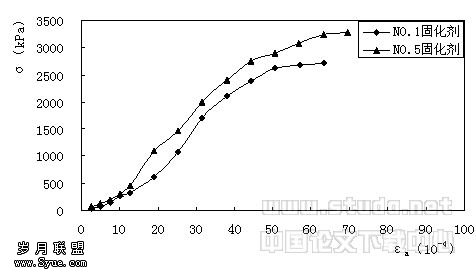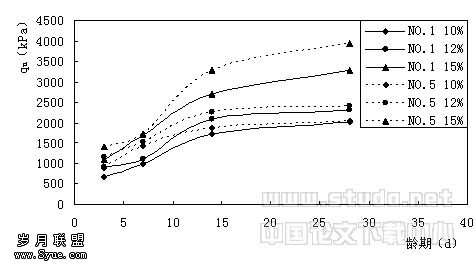 本次试验中进行了NO.1固化剂、NO.5固化剂两种固化材料对土体的加固试验。试验条件和养护条件相同,水灰比均为0.6。