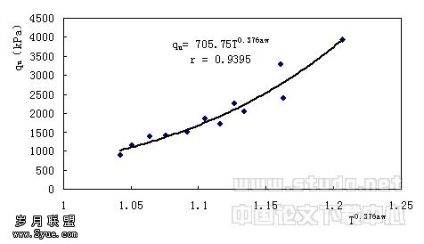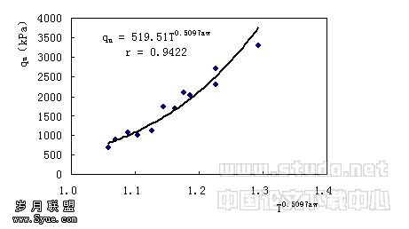 考虑到表5-1中试验系数C的变化,以T0.5097aw为横坐标,qu为纵坐标,点绘其关系见图5-3所示。由图可见,它们之间有着良好的线性相关关系。经线性回归其表达式为: