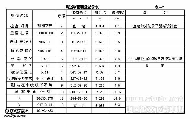 仪器置于待测断面,(竖直度盘定天顶方向为0度,顺时针注记)望远镜瞄准另一导线点或中线点定向后,转仪器正镜瞄准线路边线法线方向,也就是保证测量的竖直角读数,线路中线一侧为270-360度,线路边线一侧为0-90度。记录仪器高、观测的竖直角、斜距。根据个人习惯,亦可记录水平距离和高差。如隧道内干扰大,可在仪器定向前,竖直度盘调至90度或270度,置水准尺于水准点上,读取塔尺读数来校核视线高。测量数据记录于表--2