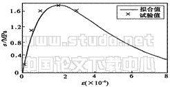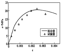 2.3 参数标定 损伤演变方程(16a、16b)的未需要试验所得到的应力、应变资料来确定。材料常数At、Bt、Ac、Bc采用选择初值试算方法通过碾压混凝土单轴拉和单轴压状态应力-应变关系曲线确定。选定碾压混凝土材料常数At=1.105,Bt=5100,Ac=0.74,Bc=400,对应的应力应变关系曲线如图4、图5.