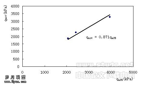 由以上关系可以看出,龄期的增长对加固土强度的影响。龄期3天时,加固土无侧限抗压强度仅为28天的无侧限抗压强度的36%~55%。回归分析中强度比为0.398;也即28天时的加固土无侧限抗压强度约为3天的无侧限抗压强度的2.513倍。在龄期7天时,加固土无侧限抗压强度约为28天的无侧限抗压强度的44%~70%,回归分析中强度比为0.527,也即28天时的加固土无侧限抗压强度约为7天的无侧限抗压强度的1.898倍,强度有一定的增长;在龄期14天时,加固土无侧限抗压强度约为28天的无侧限抗压强度的84%~94%,强度提高很快。回归分析中强度比为0.871,也即28天时的加固土无侧限抗压强度约为14天的无侧限抗压强度的1.148倍,强度有较大的增长。