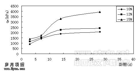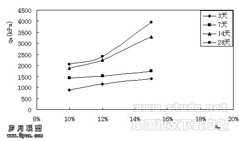 高。在掺入比aw=15%时,龄期3天、7天、14天、28天固化土的无侧限抗压强度qu分别为1402.103kPa、1736.55kPa、3288.249 kPa、3937.245 kPa。3天、7天、14天时无侧限抗压分别达28天无侧限抗压强度的36%、44%、84%。由于本身其固化强度较高,因而表现出随着龄期的增长其强度提高很快。其强度比其它两种掺入比下同龄期的都要高。固化作用得到较好发挥,强度曲线增长趋势也很快。