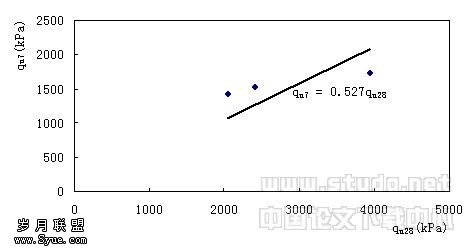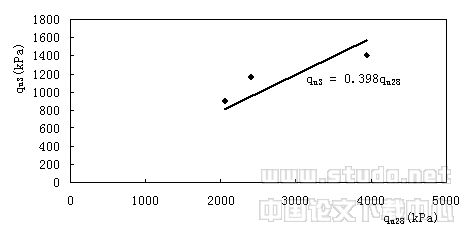 在实际固化剂加固软土应用中,比较关心如何用加固土的早期强度预测其最终加固效果。根据试验中不同龄期的加固土无侧限抗压强度的试验结果进行回归分析,其强度之间关系见图4-2、图4-3、图4-4所示。根据试验资料,龄期3天、7天、14天加固土无侧限抗压强度与28天的无侧限抗压强度大致呈线性关系。其关系如下: