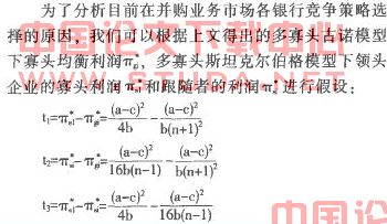 根据上述对多寡头古诺模型和斯坦克尔伯格模型下两种市场竞争方式的比较分析,不难得出一种较优的市场进入策略:当参与竞争的寡头数量不多时,存在先发优势,积极的进入市场参与竞争符合利益最大化的要求;而当参与的寡头数目达到一定量时,斯坦克尔伯格模型下的跟随者能够获得相对大的利润。根据这一结论,可以分析得出中国商业银行目前积极求索企业并购业务的原因所在。就目前中国商业银行开展企业并购业务的情况看,个别几家银行已占得先机.但是寡头数量远未达到临界点。在这样一个新业务领域采取积极介入的市场进入策略,突出重围,成为领头企业,带给企业的利润和附加效益都是非常可观的.因此中国工商银行、中国建设银行等很早就涉足了企业并购业务.并取得了一定优势。领先企业为巩固其寡头垄断地位,努力培养专业人才队伍。主动争取客户,积极进行财务规划,在创出品牌之后努力扩大目标业务群体,从而提高业务量以获取更多的利润。扩大品牌市场影响力及掌控先发优势.相对也就抑制了潜在竞争对手的发展。在巨大利益的驱使下.其他银行也看到了这种新业务的好处,积极寻求开拓。所以该业务的发展逐渐完善,整体市场竞争也越发激烈。特别是2008年末《商业银行并购贷款风险管理指引》的正式出台,允许符合条件的商业银行开办并购贷款业务,更大程度上拓展了商业银行的业务范围和盈利空间,为其深入开展企业并购业务提供了更有利的政策支持,愈加刺激了中国各商业银行在企业并购这一业务领域的竞争。