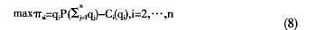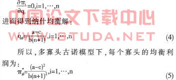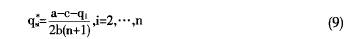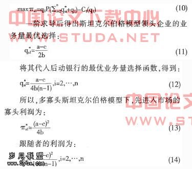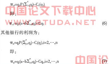 此时再考虑领头企业银行1的策略选择:由于银行l对其他后动银行的数量反应函数是给定的。也就是说银行1预测到了后动银行的选择q:,所以银行1的利润为: