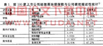 100家上市公司中最高治理指数为77.74%,最低为53.79%。相差23.95个百分点。观察前100家上市公司的绩效会发现,在盈利能力、股本扩张能力、成长性、财务安全性、股东权益等方面,前100家上市公司的平均水平都比全部样本的平均水平高,说叫前100家公司的绩效高于平均水平。 通过分析和对上市公司经理层治理指数与绩效的实证研究,《》杂志社得出如下结论: