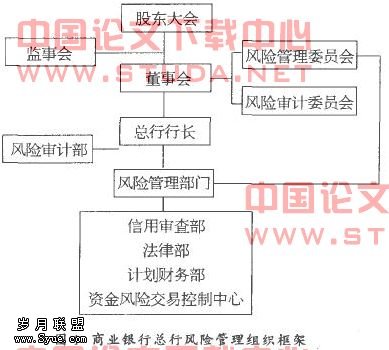(1)完善商业银行法人治理结构,明确责权划分。目前我国大多数商业银行已完成股份制改造,法人治理结构相对完善,但如何消除银行内部管理浓重的行政色彩,形成有效的权力监督和制约机制将是进一步完善法人治理结构的重点。鉴于此,商业银行可以在建立健全董事会和监事会职能的同时,引进外部独立董事,真正发挥董事会的作用,并对银行高级管理层进行监督,同时明确划分股东、董事会和高级管理层、经理人员各自的权力、责任和利益,形成三者之间权力的相互制衡。 (2)建立以董事会为核心的垂直、扁平的全面风险管理体系。商业银行全面风险管理体系的设置关键的是建立董事会管理下的风险管理组织架构。可以考虑做如图1所示的安排。